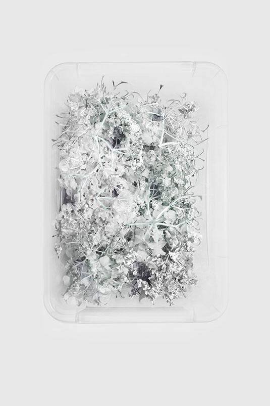 Les fleurs sont sèches et d’une beauté fragile. L’écrin de plastique un peu baroque.